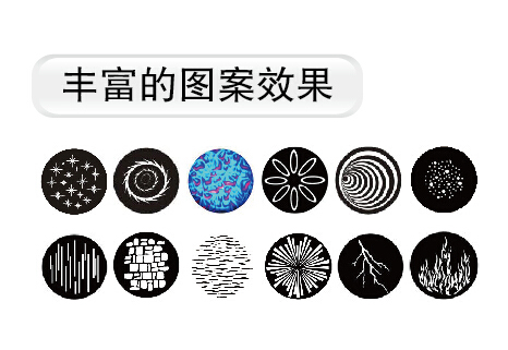2個旋轉(zhuǎn)圖案盤:每組有6個可換圖案片+白光,可安裝玻璃圖案片和金屬 圖案片